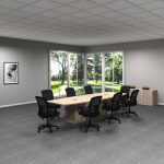 This 4’ x 10’ boat-shaped conference table balances style and function. Seating eight, it is perfect for medium-sized meeting rooms. The boat shape enhances visibility, while the cube bases add a contemporary architectural element. Built with high-quality laminate and equipped with wire management, it is a practical addition to any Granite State office.
