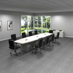 Designed for executive boardrooms, this 4’ x 14’ boat-shaped table seats twelve with ease. The traditional slab base design offers robust stability and plenty of legroom. The boat shape improves line-of-sight for all participants, while durable laminate construction ensures longevity. Includes cable management for a tidy workspace.