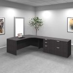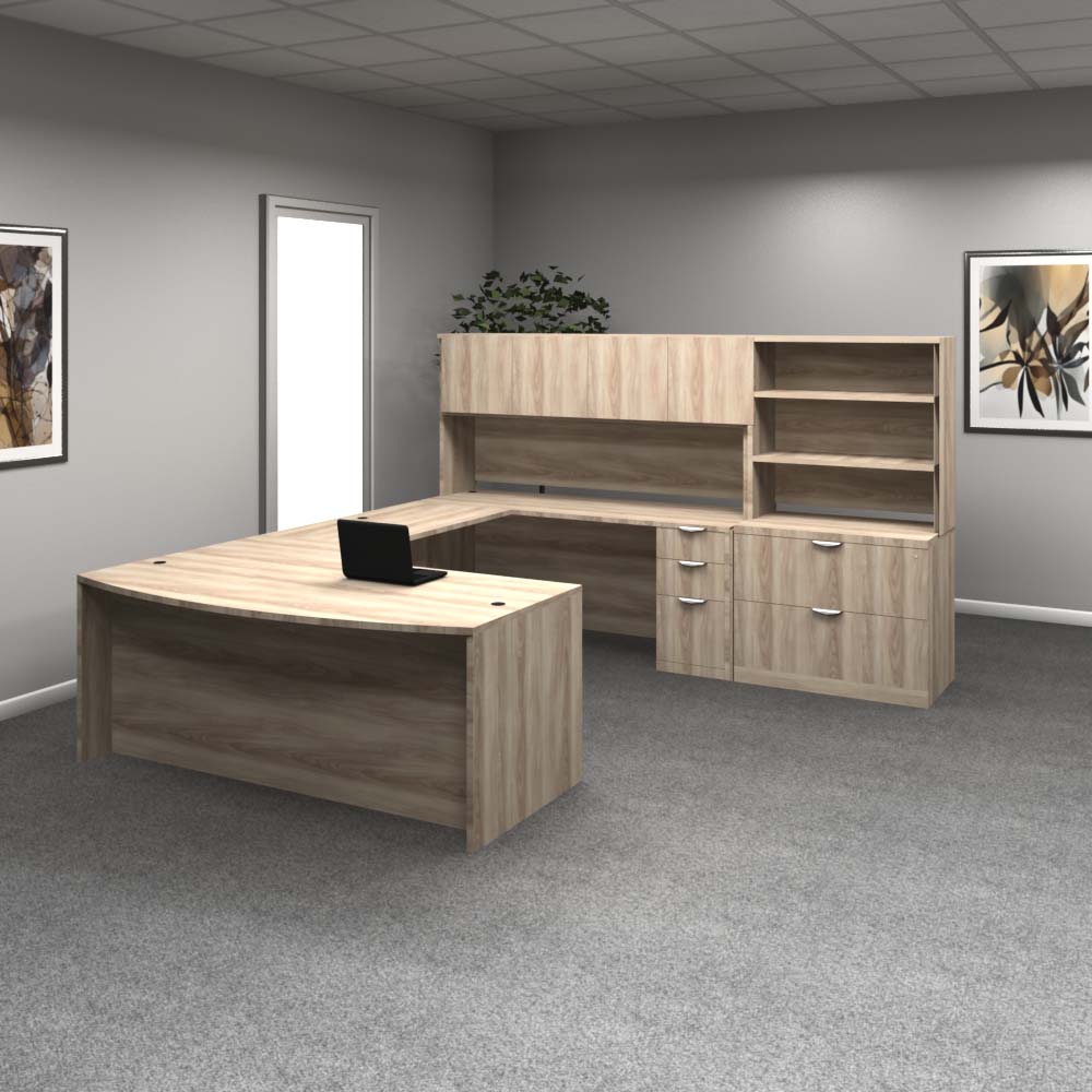 • Features: Bowfront design, L-shaped configuration, locking pedestal storage, cable management grommets, full modesty panel, durable laminate construction