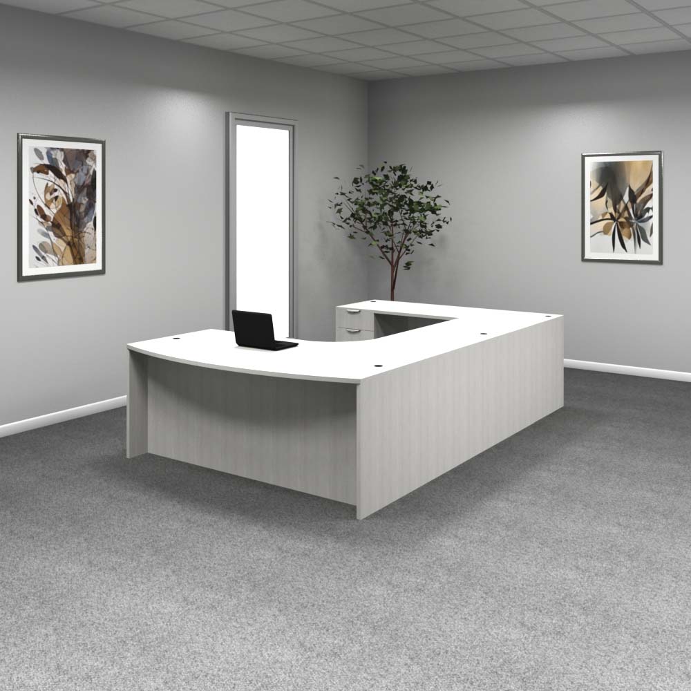 | Features | Bowfront design, U-shaped configuration, secure pedestal storage, overhead 4-door hutch, cable management grommets, full modesty panel, durable laminate construction |