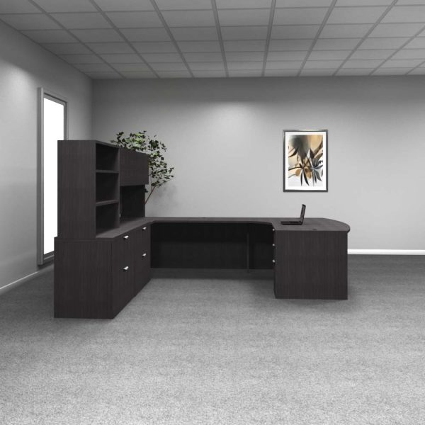 • Features: Bowfront design, U-shaped configuration, dual lateral files, open and enclosed hutch storage, secure pedestal drawers, cable management grommets, full modesty panel, durable laminate construction