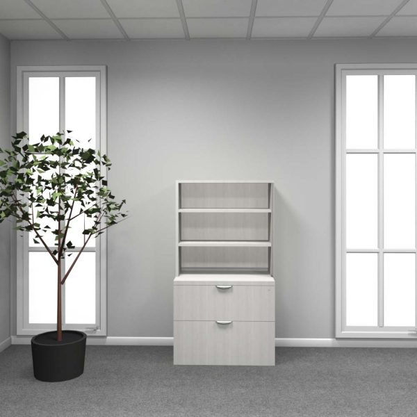 36” lateral file credenza with open hutch and adjustable shelves.