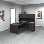 The Maple Rectangular L Desk #5 offers a warm, professional workspace with plenty of shelving. Includes a locking pedestal, lateral file, and an open hutch for easy access to binders and books. Available in 9 stocked colors.
