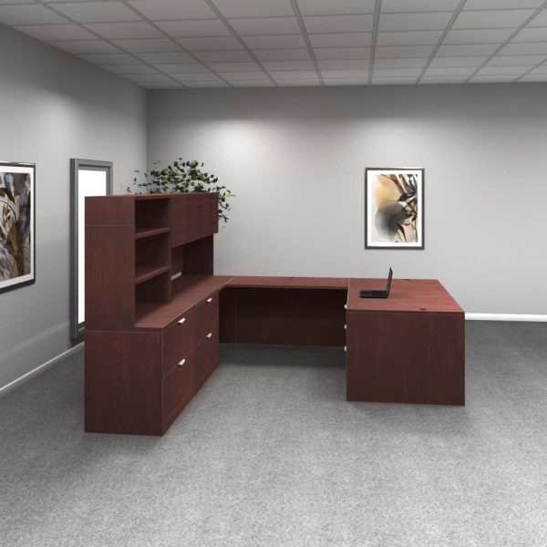 The Rectangular U Desk #6 in Cherry is a powerhouse workstation. It surrounds you with storage, featuring a locking pedestal, two lateral files, an open hutch, and a closed hutch. The rectangular design maximizes surface area for multiple monitors and projects. Available in 9 stocked colors.