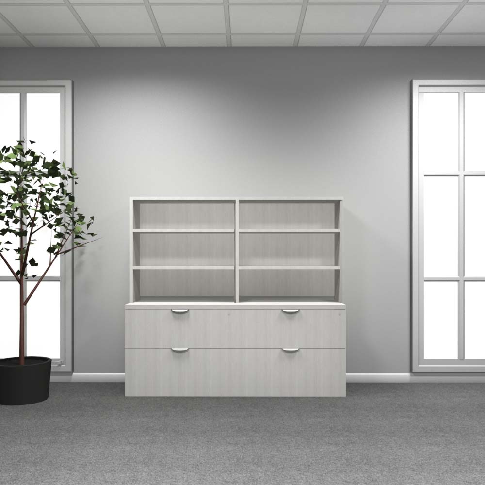 Combine concealed storage with open accessibility in this 72-inch unit. The base features four locking storage doors, while the top supports two open hutches with adjustable shelving. It’s an excellent choice for collaborative spaces that need both secure storage and shared resources.